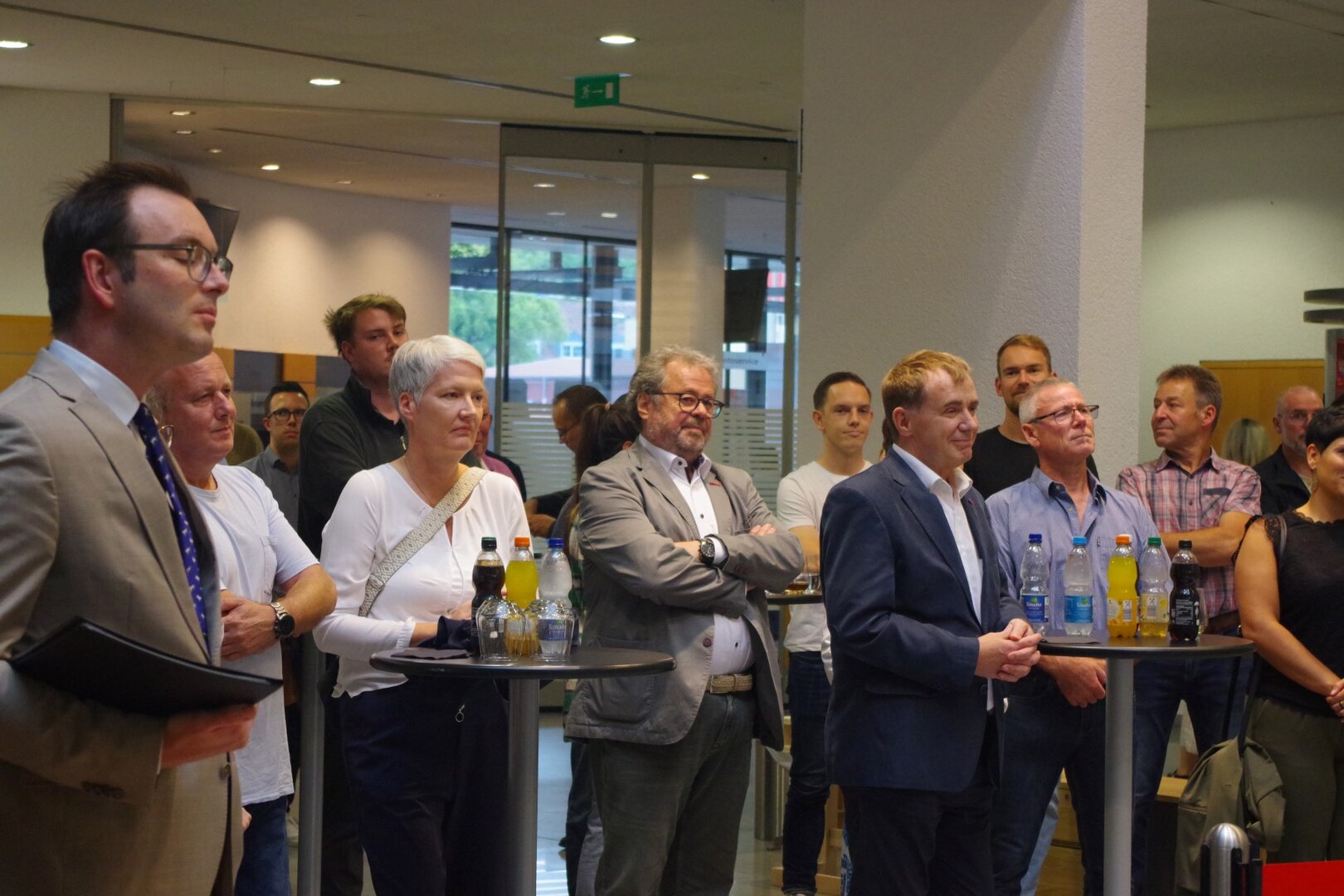 Herr Michael Schneider (Vorstandsvors. VoBa Main-Tauber), Herr Prof. Dr. Wolfgang Reinhart (MDL), Herr Jochen Haag (Obermeister), Herr Paul Mendel (HWK)